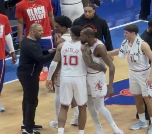 哈登帶阿倫和后衛(wèi)群一組,維持兩位數(shù)分差。米球帶施羅德一口氣拉開18分。第一節(jié)比賽就結(jié)束了。