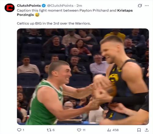 波爾津吉斯曾在23-24賽季跟隨綠凱一同奪得NBA總冠軍,隨后被綠凱放棄,但他與隊內(nèi)很多球員都有著深厚的情感,賽前杰倫-布朗跟波爾津吉斯相談甚歡,第二節(jié)波神獲得登場機會,4中2+三分2中1拿到5分1籃板。