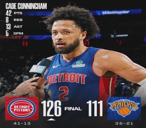 活塞狀元坎寧安今天開啟暴走模式:首發(fā)出戰(zhàn)38分鐘,34投17中,三分11中5,罰球3中3,狂轟42分8籃板13助攻1搶斷2蓋帽。他成為NBA歷史上第三個(gè)在麥迪遜廣場花園轟下40分+10助攻的客隊(duì)球員,前兩個(gè)是艾弗森和詹姆斯。