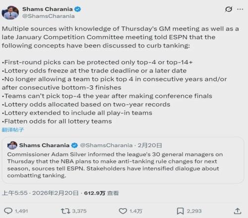 NBA官方計(jì)劃推出多項(xiàng)新規(guī)打擊故意擺爛:1、禁止球隊(duì)連續(xù)兩年獲得前四順位簽;2、連續(xù)兩年聯(lián)盟倒數(shù)前三的球隊(duì)不再獲得高順位簽;3.打進(jìn)分區(qū)決賽的球隊(duì),第二年不能獲得前四順位;4、根據(jù)兩年的綜合戰(zhàn)績,分配樂透抽簽概率。