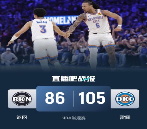 比賽開(kāi)始,雙方上來(lái)效率都一般,雷霆主打內(nèi)線,小波特有攻有傳帶領(lǐng)籃網(wǎng)回應(yīng),首節(jié)籃網(wǎng)還領(lǐng)先2分,次節(jié)雙方命中率還是一般,以賽亞·喬連續(xù)三分命中迅速上雙,雷霆轟出一波小高潮領(lǐng)先到雙位數(shù),籃網(wǎng)次節(jié)僅10分,雷霆擴(kuò)大至17分領(lǐng)先。下半場(chǎng),雷霆持續(xù)發(fā)力拉開(kāi)20分以上領(lǐng)先,小波特繼續(xù)攻傳帶隊(duì)打出進(jìn)攻波追分,雙方圍繞著10分左右分差展開(kāi)拉鋸戰(zhàn),末節(jié)雷霆上來(lái)11-3重新拉開(kāi)至近20分領(lǐng)先,籃網(wǎng)再無(wú)機(jī)會(huì),最終雷霆105-86輕取籃網(wǎng)。
