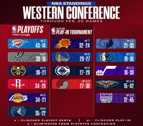 北京時(shí)間2月21日的常規(guī)賽打完后,西部的格局又發(fā)生了一些變化,雷霆大勝籃網(wǎng)但還是丟掉了聯(lián)盟第一,因?yàn)閯俾室呀?jīng)不如活塞;快船逆轉(zhuǎn)湖人失敗但開(kāi)拓者慘敗掘金,快船還是穩(wěn)住了西部第九的席位。湖人與森林狼沒(méi)有勝場(chǎng)差,湖人是艱難壓制森林狼。