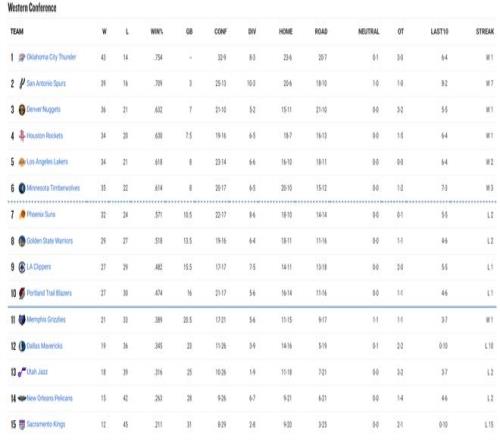 西部排名:雷霆、馬刺、掘金、火箭、湖人、森林狼、太陽(yáng)、勇士、快船、開(kāi)拓者、灰熊、獨(dú)行俠、爵士、鵜鶘、國(guó)王。