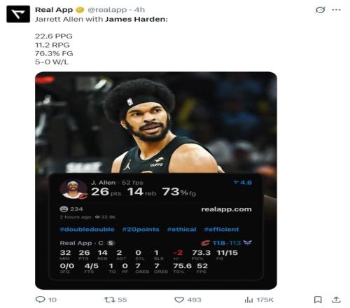 在哈登加盟騎士后,賈萊特-阿倫是最受益的那個(gè),他場(chǎng)均拿到22.6分11.2籃板,真實(shí)命中率76.3%。