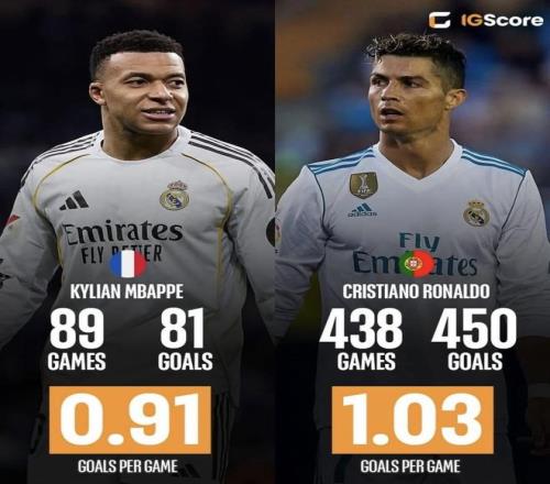 姆巴佩在皇馬前89場(chǎng)打進(jìn)81球,場(chǎng)均0.91,放在任何時(shí)代都算“開(kāi)局就爆”。但對(duì)照C羅的皇馬數(shù)據(jù),真正讓人服氣的不是總進(jìn)球有多夸張,而是他把“超過(guò)一球一場(chǎng)”的效率,硬生生撐到了更長(zhǎng)的比賽跨度:皇馬官網(wǎng)給出的俱樂(lè)部數(shù)據(jù)是438場(chǎng)451球。