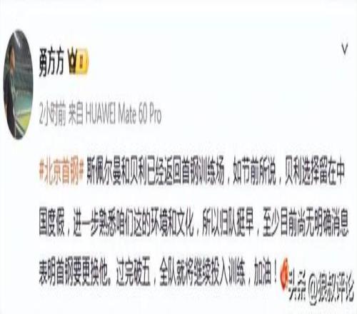 北京時(shí)間2月21日,根據(jù)北京記者勇方方的報(bào)道,“斯佩爾曼和貝利已經(jīng)返回首鋼訓(xùn)練場(chǎng),如節(jié)前所說,貝利選擇留在中國(guó)度假,進(jìn)一步熟悉咱們這的環(huán)境和文化,所以歸隊(duì)挺早,至少目前尚無明確消息表明首鋼要更換他。過完破五,全隊(duì)就將繼續(xù)投入訓(xùn)練,加油! ”