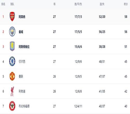 在積分榜上,阿森納依然占據(jù)榜首位置,戰(zhàn)績(jī)是17勝7平5負(fù),拿到58分。曼城贏球之后繼續(xù)縮小與阿森納的差距。曼城總積分達(dá)到56分,僅僅落后阿森納2分。曼城最快下一輪能夠登頂,當(dāng)然,大前提是阿森納丟分。沒想到阿森納之前累積的優(yōu)勢(shì)變得這么小。阿斯頓維拉51分排名第3。戰(zhàn)平的切爾西總積分是45分,排名第4。少賽一場(chǎng)的曼聯(lián)也是45分,排名第5。利物浦以42分排名第6。