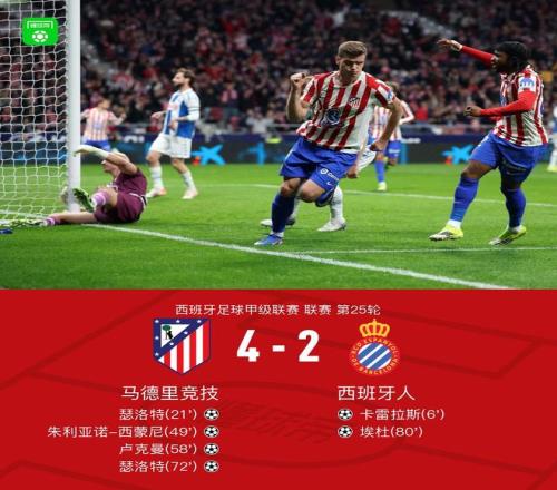 北京時(shí)間2月22日西班牙足球甲級(jí)聯(lián)賽 聯(lián)賽 第25輪,馬德里競(jìng)技主場(chǎng)對(duì)陣西班牙人。上半場(chǎng),卡雷拉斯破門,瑟洛特扳平比分。下半場(chǎng),巴埃納助攻,小西蒙尼幫助馬競(jìng)反超比分。魯杰里隨后送出兩次助攻,盧克曼和瑟洛特相繼破門。埃杜遠(yuǎn)射得分,為客隊(duì)扳回一城。全場(chǎng)比賽結(jié)束,馬競(jìng)4-2擊敗西班牙人。