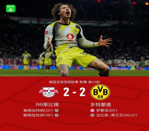 北京時(shí)間2月22日德國足球頂級(jí)聯(lián)賽 聯(lián)賽 第23輪,RB萊比錫主場(chǎng)對(duì)陣多特蒙德。上半場(chǎng)迪奧曼德晃動(dòng)送助攻,鮑姆加特納破門,之后勞姆傳中,鮑姆加特納破門完成雙響。下半場(chǎng)羅慕洛頭球自擺烏龍,補(bǔ)時(shí)階段阿德耶米傳中,法比奧-席爾瓦扳平。最終多特2-2戰(zhàn)平萊比錫。