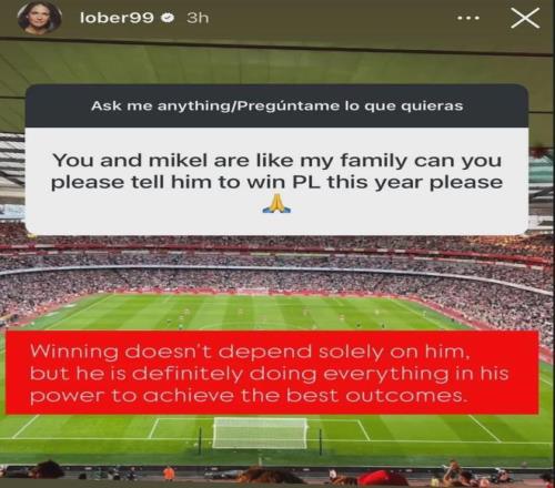 阿爾特塔的妻子Lorena在IG上發(fā)圖文回應(yīng)了球迷的提問,這名球迷表示“你能不能告訴阿爾特塔,請拿下今年的英超冠軍”。