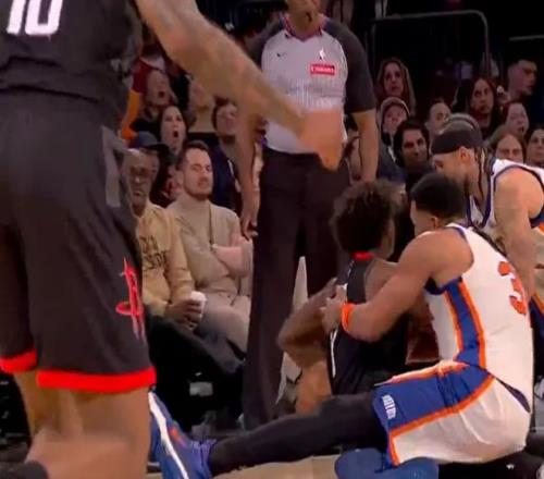 次節(jié)回來,OG-阿奴諾比里突外投連拿5分,尼克斯打出7-0攻勢領(lǐng)先到13分。小賈巴里底角三分再投進,目前4中4、三分2中2已經(jīng)砍下10分,艱難帶隊追分。唐斯兇狠撲球 ,一屁股坐到泰特右膝致后者受傷 ,隨后一瘸一拐被隊醫(yī)攙扶下場,這個動作真危險,給個一級惡意都不過分,裁判連個普通犯規(guī)都沒有,爭議太大了。