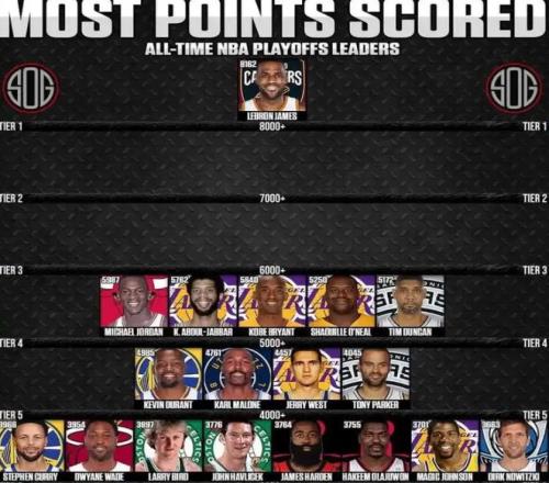 第三個(gè),詹姆斯季后賽總得分8162分。大家常說,季后賽是檢驗(yàn)巨星成色的舞臺,每一場比賽都是生死戰(zhàn),強(qiáng)度拉滿,老詹能攢下這個(gè)分?jǐn)?shù),靠的是19次季后賽、280多場出場,還有場均近30分的穩(wěn)定輸出。現(xiàn)役球員中,最接近詹姆斯的球員是杜蘭特,他的季后賽得分為4985分,差了快3000多分,之后的庫里、哈登、倫納德差距更多!年輕球員中,塔圖姆季后賽總得分來到2936分,與詹姆斯差距5000多分,按照塔圖姆的季后賽的平均數(shù)據(jù)來說,每個(gè)賽季打13.67場比賽,場均24.1分,每個(gè)賽季季后賽合計(jì)拿329分,要再拿5000多分,需要塔圖姆再打16年的季后賽,且需要保證自己年年巔峰!顯然,詹姆斯的這份紀(jì)錄,后人只能仰望。