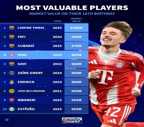 球員18歲生日當(dāng)天德轉(zhuǎn)身價(jià)榜:亞馬爾2億歐居首,卡爾6000萬歐