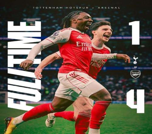 2球落后,圖多爾沒有猶豫立馬換上索蘭克、里沙利松和特爾做最后一搏;第83分鐘,斯彭斯右路一對(duì)一強(qiáng)行突破橫傳,里沙利松腳后跟嗑向球門,拉亞在皮球即將越過門線前將球撈回,熱刺險(xiǎn)些追回一球。第94分鐘,馬丁內(nèi)利積極反搶斷球,馬杜埃凱順勢(shì)分球,厄德高果斷直塞,哲凱賴什頂開格雷后捅射一樣梅開二度,4:1!最終在埃澤和哲凱雙雙梅開二度下,阿森納本賽季雙殺熱刺,第一次在英超對(duì)熱刺拿下4連勝;目前槍手多賽1場(chǎng)暫且領(lǐng)先曼城5分。
