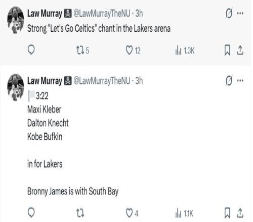賽后記者Law Murray曝出,在比賽失去懸念后,湖人主場響起了“凱爾特人加油”的呼聲以表達對主隊表現(xiàn)的不滿。