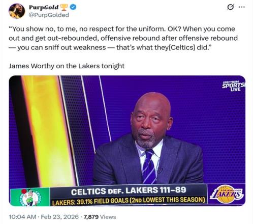 作為解說嘉賓的湖人名宿沃西更是一針見血的指出:“你們沒有表現(xiàn)出對紫金軍團球衣的尊重,一次又一次被對手搶下前場籃板,這讓他們嗅到了你們的弱點?!?/p>