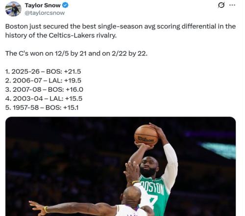湖人隊不僅被凱爾特人隊常規(guī)賽雙殺橫掃, 兩場還一共輸?shù)?3分之多,場均凈輸21.5分創(chuàng)造凱湖單賽季場均勝分差新高。