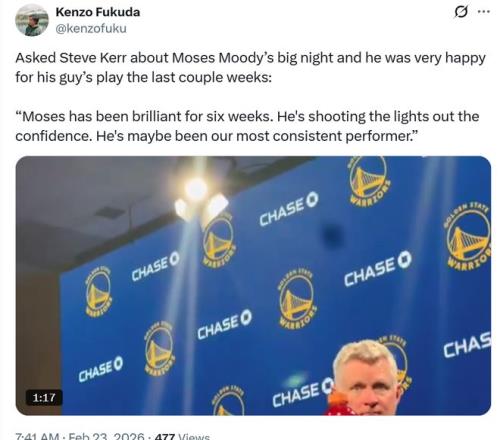 除了霍福德之外,另外一名首發(fā)穆迪也交出神奇表現(xiàn),全場(chǎng)16中9,三分9中4,拿下23分7板5助1搶斷,在四大核心缺席的情況下,繼續(xù)扮演最穩(wěn)定的得分點(diǎn)。