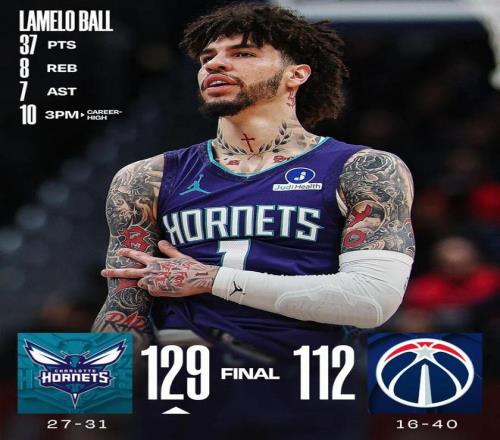 這場(chǎng)比賽,黃蜂當(dāng)家球星拉梅洛鮑爾打出了個(gè)人賽季最佳表現(xiàn)之一:全場(chǎng)只打了27分鐘,投籃20中12,三分15中10,罰球3中3,得到37分8籃板7助攻。