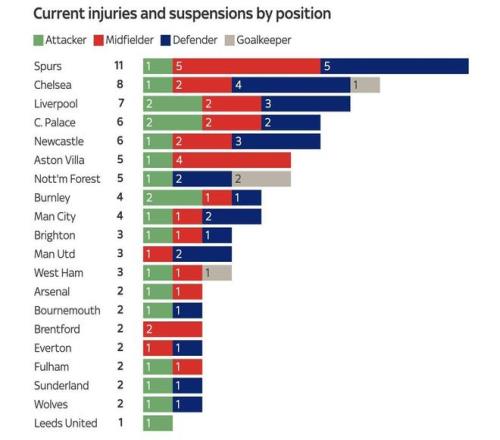 熱刺當前11人受傷為英超最多,阿森納僅2人傷停