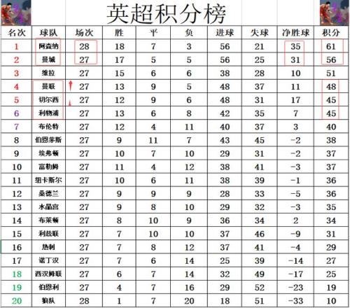 積分榜方面,阿森納多賽一場,領(lǐng)先曼城5分,阿森納要想打破20多年的冠軍荒,最后10輪就不能再像以往一樣掉鏈子,畢竟多一場多5分,優(yōu)勢并不算太大。曼聯(lián)今天準(zhǔn)絕殺贏球后,超過切爾西,利物浦3分,重回前4,落后第3的維拉3分。