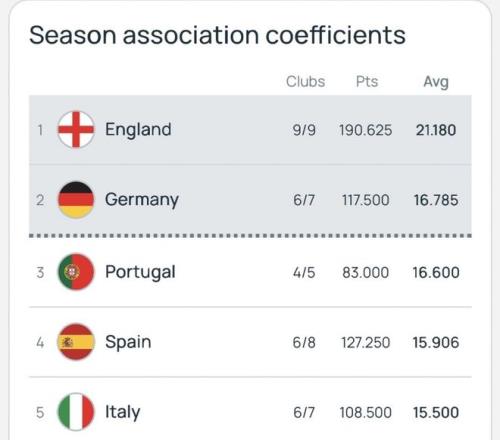 真沒落了!歐戰(zhàn)積分對比英超領(lǐng)跑實(shí)至名歸,意甲跌落至第五名