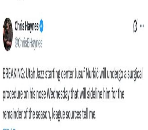 北京時間2月24日,據(jù)名記Haynes報道,猶他爵士隊中鋒努爾基奇將于明日接受鼻子手術(shù),賽季報銷。努爾基奇幾年前鼻子骨折后,一直飽受呼吸和睡眠問題的困擾。