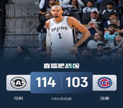 比賽開始,瓦塞爾連續(xù)3記三分,馬刺轟出14-2夢幻開局,坎寧安攻防止血,霍蘭連續(xù)2+1加三分砍下9分助活塞反超,次節(jié)坎寧安連續(xù)殺內(nèi)線在拉開比分,但馬刺連續(xù)3記三分反超回來,隨后雙方展開膠著拉鋸戰(zhàn),半場馬刺反超2分。下半場,雙方繼續(xù)拉鋸戰(zhàn),文班亞馬大帽加三分,馬刺9-0領先到雙位數(shù),坎寧安進攻端還是不在狀態(tài),三節(jié)馬刺領先8分,末節(jié)文班亞馬統(tǒng)治攻防帶隊7-0再次拉開比分,杜倫接連內(nèi)線強打止血回應,瓦塞爾和尚帕尼、凱爾登又相繼扔進三分,文班亞馬連續(xù)暴扣保持住雙位數(shù)領先,最終馬刺114-103力克活塞。