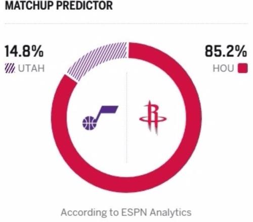 反觀爵士,目前戰(zhàn)績?yōu)?8勝39負(fù),本賽季爵士隊(duì)完成重磅交易,為補(bǔ)強(qiáng)防守實(shí)力引進(jìn)了前最佳防守球員小賈倫·杰克遜,加之本賽季狀態(tài)爆發(fā)的基昂特·喬治,球隊(duì)未來潛力不容小覷。但目前爵士隊(duì)遭遇嚴(yán)重傷病困擾,四大主力缺陣,陣容殘缺的他們?cè)诒举惣靖嗍窍脲憻掙?duì)伍,擺爛俯沖狀元簽,此役戰(zhàn)意不足!賽前,ESPN預(yù)測這場比賽,火箭贏球概率高達(dá)85.2%,爵士贏球概率只有14.8%。
