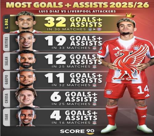 2025/26賽季進球+助攻最多(迪亞斯vs利物浦攻擊手)