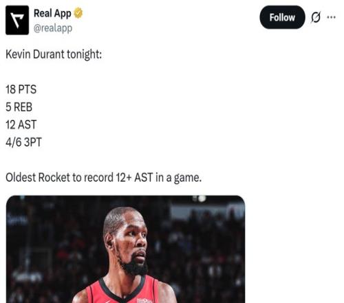 值得一提的是,12次助攻不僅是杜蘭特火箭生涯新高,37歲147天的杜蘭特也成為火箭隊(duì)史單場(chǎng)送出至少12次助攻年齡最大的球員。