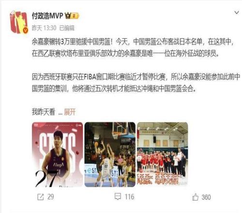 根據(jù)媒體人付政浩的消息,西班牙聯(lián)賽只有在FIBA窗口期比賽臨近的時候才會暫停比賽,所以留給余嘉豪的時間非常短,當?shù)貢r間昨天晚上他還在打比賽,今天連續(xù)周轉(zhuǎn)5次航班累計飛行超過1.4萬公里才能抵達沖繩,這種精神值得所有男籃球員們學習。昨天客場的比賽是在西班牙位于非洲的飛地梅利利亞打的,比賽結束后余嘉豪先從梅利利亞飛往馬加拉,然后再飛回巴塞羅那,從巴塞羅那飛往北京,再從北京飛往東京,最后一程是東京飛往沖繩。