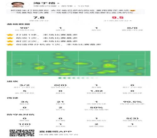 體育播報(bào)2月25日宣 博德閃耀在本輪歐冠客場(chǎng)2-1力克國(guó)米,海于格本場(chǎng)數(shù)據(jù)如下: