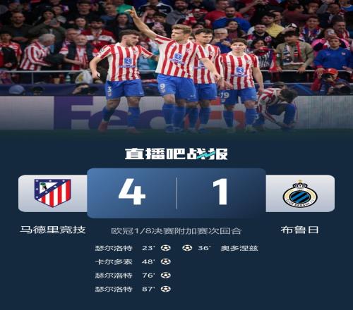 馬競4-1總比分7-4淘汰布魯日,晉級歐冠16強!抽簽將面對利物浦或熱刺的其中之一。