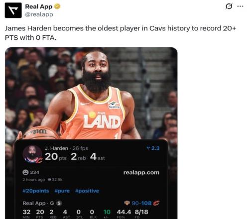憑借這樣的表現(xiàn),36歲零183天的哈登成為騎士隊(duì)史上單場(chǎng)0罰球情況下砍下20+最老的球員。