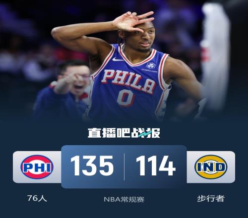 上半場,雙方開場勢均力敵,比分交替領先,步行者持續(xù)發(fā)力,內(nèi)外開花逐漸占據(jù)場上主動,次節(jié)步行者突然啞火,76人轟出24-2的進攻狂潮確立兩位數(shù)優(yōu)勢,馬克西和恩比德聯(lián)手高效拿分,米卡·波特成為奇兵里突外投帶隊追趕,半場戰(zhàn)罷76人75-65領先步行者。下半場,76人牢牢占據(jù)場上主動,內(nèi)外開花不斷擴大領先,馬克西兩罰全中將分差拉開到20分以上,末節(jié)76人穩(wěn)扎穩(wěn)打保持大比分的領先,步行者大勢已去無力回天。最終,76人135-114輕取步行者,客場過關。