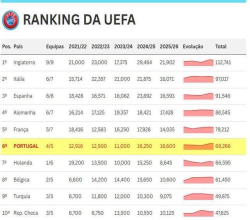 根據(jù)統(tǒng)計,如果本菲卡戰(zhàn)勝皇馬,葡萄牙將確保在2027-28賽季重新獲得三個歐冠參賽名額(兩個直接晉級,一個進入第三輪預(yù)選賽)。葡萄牙的球隊只需在本賽季結(jié)束前贏得一場勝利——無論是本菲卡、葡萄牙體育、波爾圖還是布拉加——就可以超越荷蘭,獲得歐足聯(lián)排名第六的位置。