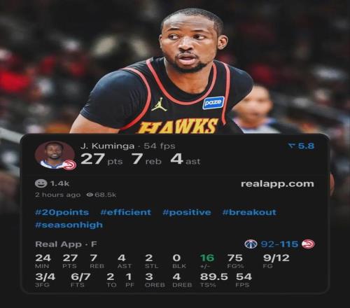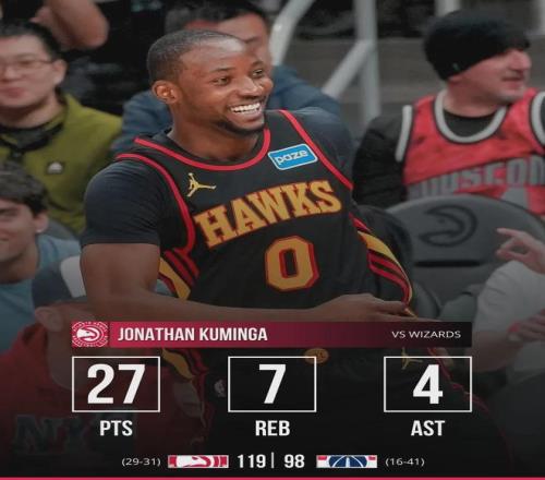 迎來老鷹生涯首秀的庫明加表現(xiàn)十分搶眼,替補出戰(zhàn)約24分鐘,投籃12中9,其中三分4中3,罰球7中6無比高效砍下27分外加7板4助2斷全面數(shù)據(jù),正負值+16,幫助新東家119-98輕松擊敗奇才。