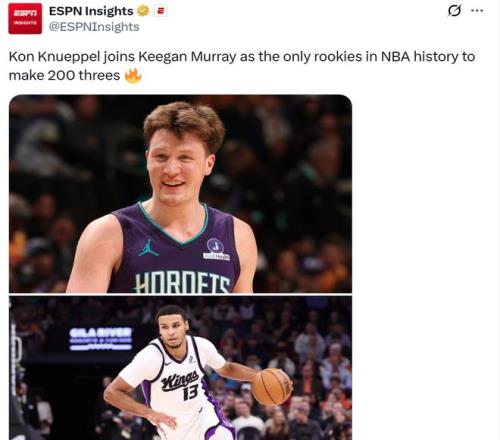 紀(jì)錄四:新秀賽季已經(jīng)命中201記三分升至NBA新秀歷史第二,僅次于基根穆雷的206記,按照克努佩爾的表現(xiàn),他反超并大幅提升這一紀(jì)錄只是時(shí)間問題;