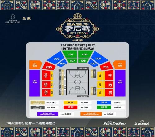 3月20日半決賽票價(jià)為澳門幣180元起,3?月?22?日決賽日票價(jià)為澳門幣?210?元起。兩日賽事均于新濠集團(tuán)旗下、可容納?5,000?名觀眾的新濠影匯綜藝館舉行。