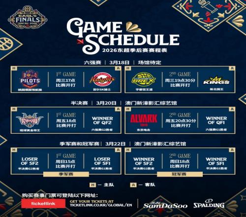 3月18日17:00,第一場六強(qiáng)賽桃園璞園領(lǐng)航猿將率先迎戰(zhàn)首爾SK騎士;19:30則由宇都宮王道對(duì)陣新北國王。3月20日的半決賽分別于?18:00?及?20:30?開賽。3月22?日決賽日,季軍戰(zhàn)將于?15:00?打響,而萬眾期待的冠軍決戰(zhàn)即將在18:00?準(zhǔn)時(shí)上演,為2026賽季畫上完美句點(diǎn)。