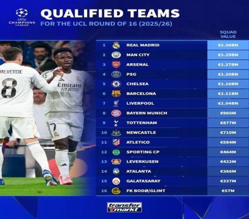 25/26賽季歐冠16強(qiáng)身價(jià)排行(單位:歐元)