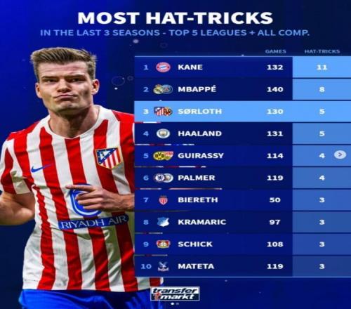 歐冠1/8決賽附加賽次回合,馬競(jìng)主場(chǎng)4比1擊敗布魯日,馬競(jìng)前鋒瑟爾洛特戴帽。德轉(zhuǎn)列出五大聯(lián)賽球員最近三個(gè)賽季在各項(xiàng)賽事戴帽次數(shù)榜,瑟爾洛特與哈蘭德5次并列第三,凱恩11次居首。