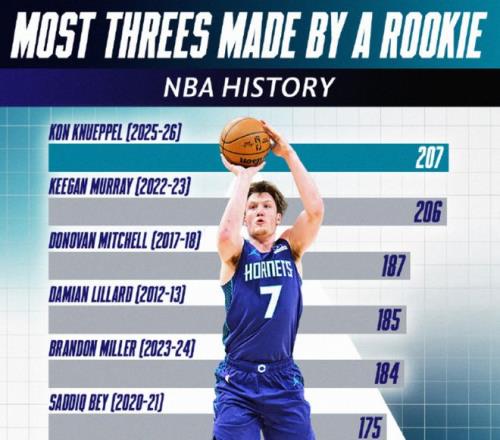 這樣一來(lái),克尼普爾的NBA生涯三分球命中數(shù)就達(dá)到了209個(gè),正式超越了薩克拉門(mén)托國(guó)王隊(duì)的基根-穆雷的206個(gè),成為NBA史上新秀三分王。要知道,克尼普爾只打了59場(chǎng)常規(guī)賽,而基根-穆雷用了80場(chǎng)常規(guī)賽。