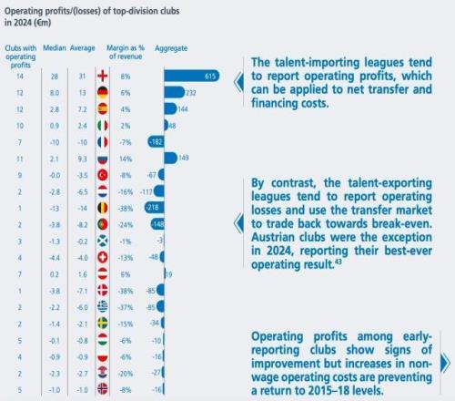 報(bào)告指出,人才引進(jìn)型聯(lián)賽往往盈利,這些利潤(rùn)可用于支付凈轉(zhuǎn)會(huì)費(fèi)和融資成本。相比之下,人才輸出型聯(lián)賽往往運(yùn)營(yíng)虧損,并利用球員買賣以期實(shí)現(xiàn)收支平衡。