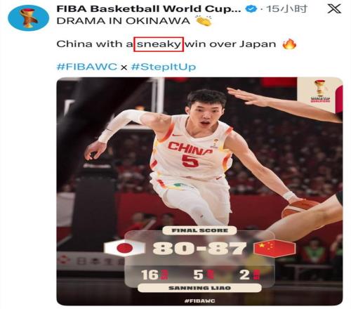 這場來之不易的逆轉勝利,本應是中國男籃拼搏精神的最好證明,卻在賽后引發(fā)了一系列爭議。比賽結束后,國際籃聯(lián)(FIBA)官方社媒發(fā)布戰(zhàn)報,使用了“中國男籃從日本偷走一場勝利”(China with a sneaky win over Japan)的表述,其中“sneaky”一詞自帶“鬼祟、不光彩”的貶義,絕非描述逆轉的中性用詞,直接否定了中國男籃整場比賽的拼搏成果,瞬間引發(fā)全球輿論嘩然。