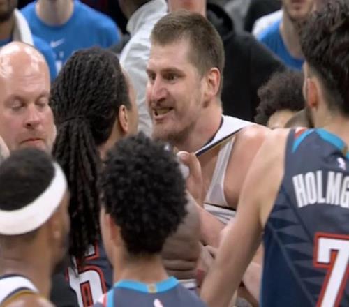 比賽末節(jié),約基奇這賽季的一個(gè)名場(chǎng)面出現(xiàn)。多爾特的一個(gè)壞動(dòng)作將約基奇撞倒,約基奇起身之后馬上急眼找多爾特要說(shuō)法,杰林追上來(lái)揪住約基奇的球衣拉扯,約基奇呲著牙怒目而視,場(chǎng)面一度非常嚇人。