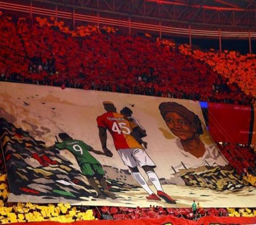 比賽還沒開踢,加拉塔薩雷的看臺上就緩緩展開了一幅巨大的看臺海報(bào)(Tifo)。畫面里不僅畫著奧斯梅恩,還有他早逝的母親,兩人都穿著球衣。海報(bào)下方還配了一句極其戳心的話:“我們是一家人,家人就是一切?!?/p>