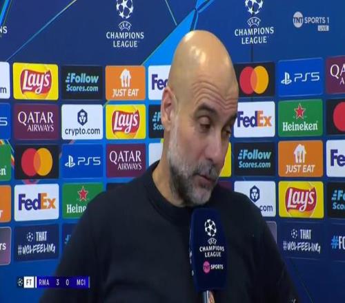 率隊(duì)在歐冠1/8決賽首回合客場0-3慘敗給皇家馬德里之后,曼城主教練瓜迪奧拉接受了來自TNT體育的采訪。