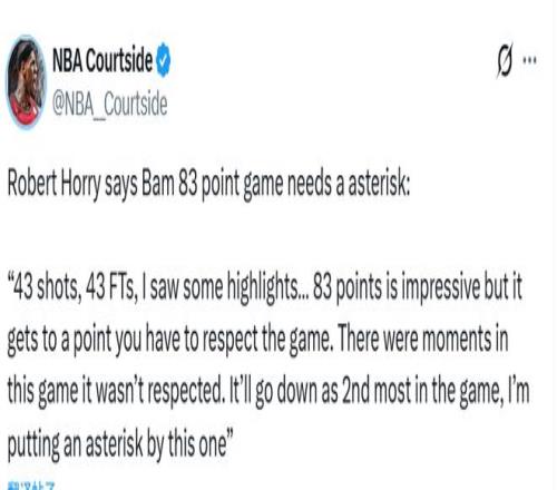 霍里在節(jié)目上表示,阿德巴約的83分應加個星號?!?3次出手,43次罰球。我看了集錦... 83分確實令人驚嘆,但比賽到了某個程度,你必須尊重這項運動。這場比賽中有一些時刻并未沒有尊重比賽。這會成為歷史上單場第二高分,但我會給它加個星號標記?!?/p>